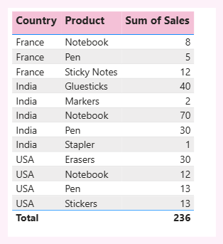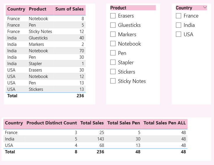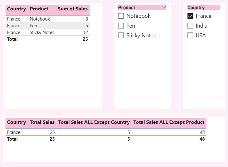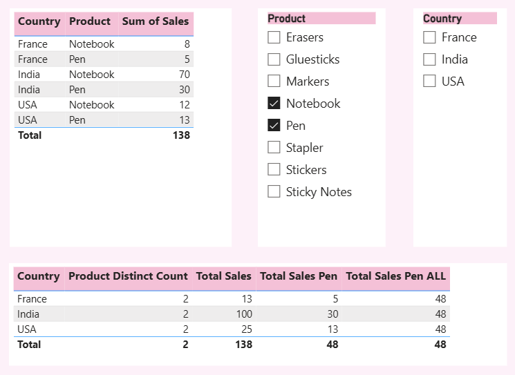 Total Sales All Except Country = CALCULATE(SUM('Sales Data'[Sales]), ALLEXCEPT('Sales Data', 'Sales Data'[Country]), 'Sales Data'[Product] = "Pen")