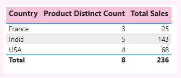 Total of Product distinct Count is 8, while the sum of 3, 5 and 4 is 12. The reason is total works in a different filter context. 8 is the total distinct values from the input dataset and not the sum of distinct counts for all countries.