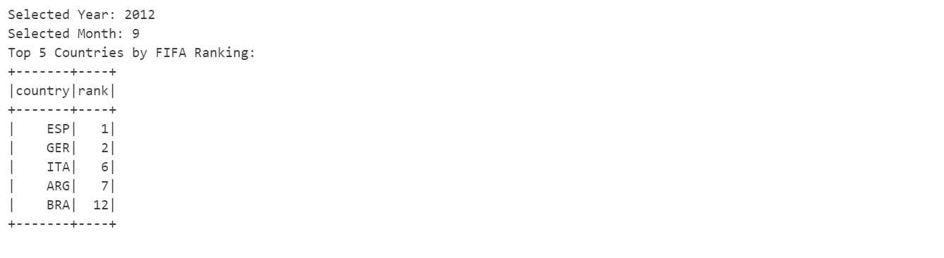 In this PySpark-based analysis, we explore historical FIFA rankings. The dataset includes monthly ranking data for countries like Argentina (ARG), Brazil (BRA), Espanol (ESP), France(FRA), Germany (GER) and Italy (ITA).
