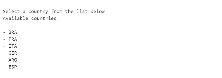countries = ['ARG', 'BRA', 'ESP', 'FRA', 'GER', 'ITA']
