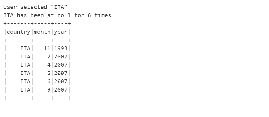 rankings_reshaped.filter((col("country") == selected_country) & (col("rank") == 1))