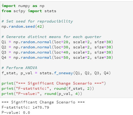 Let’s walk through a hands-on example using Python to illustrate how One-Way ANOVA works in practice.