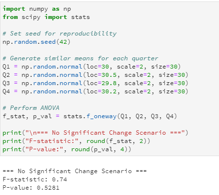 This means we fail to reject the null hypothesis, concluding that there’s no statistically significant difference in sales across quarters.