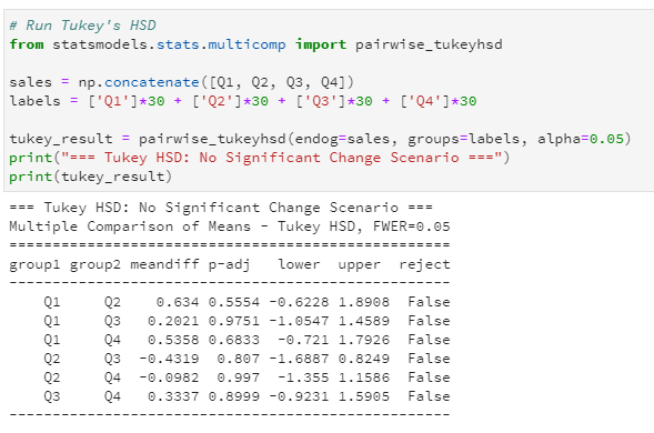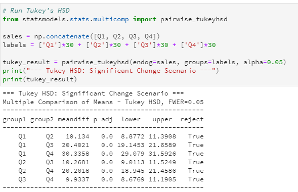 Let’s say your ANOVA test returns a significant result (p-value < 0.05). That means at least one group is different—but which one? Is Q2 higher than Q1? Is Q4 different from Q3? To answer that, you need a post-hoc test.