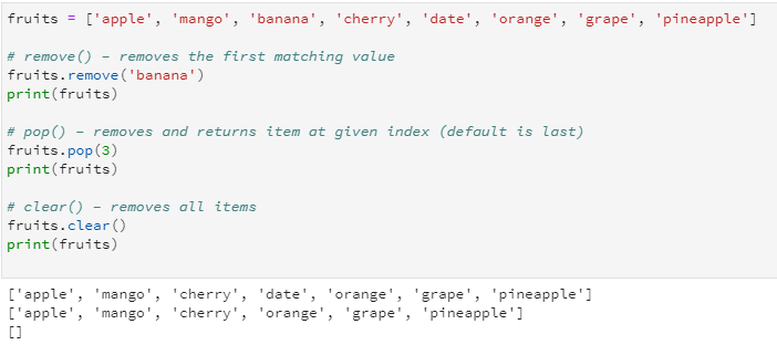 Python provides several ways to remove items from a list. Each method serves a different purpose: