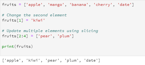 To update or change the value of an element in a Python list, you can assign a new value to a specific index. Lists are mutable, which means their contents can be changed after creation. You can also update multiple elements at once using slicing.