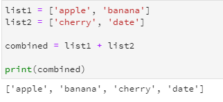You can concatenate (combine) two or more lists in Python using the + operator. This creates a new list that contains all the elements from the original lists in the order they appear.
