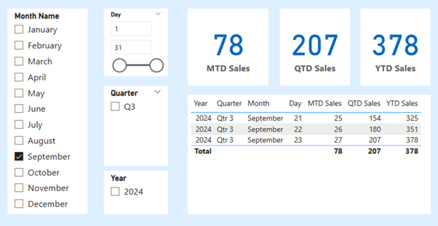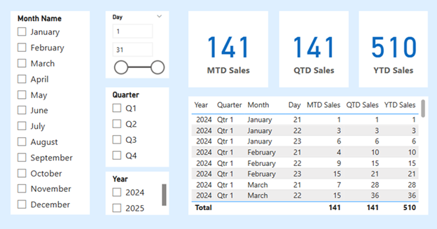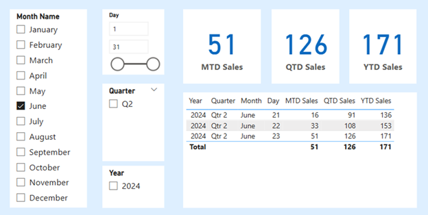 If a different period is selected using the slicer, the MTD, QTD, and YTD measures will automatically update to reflect the new time frame.